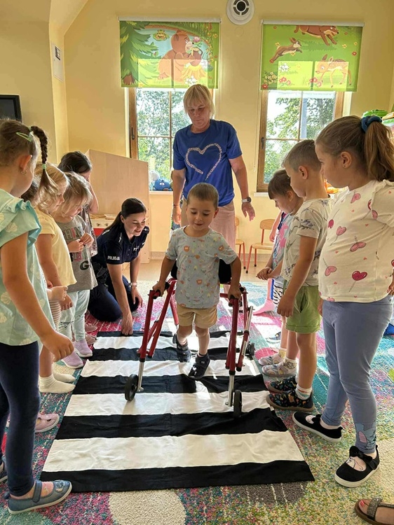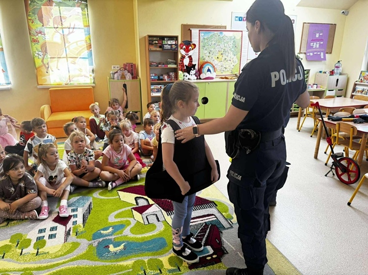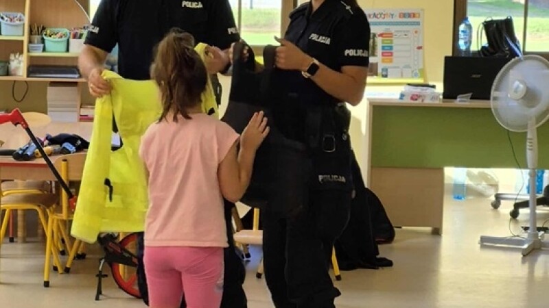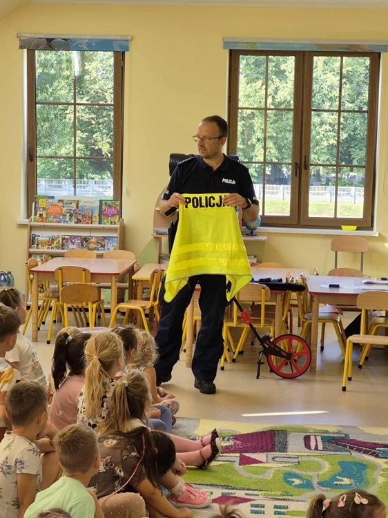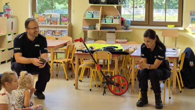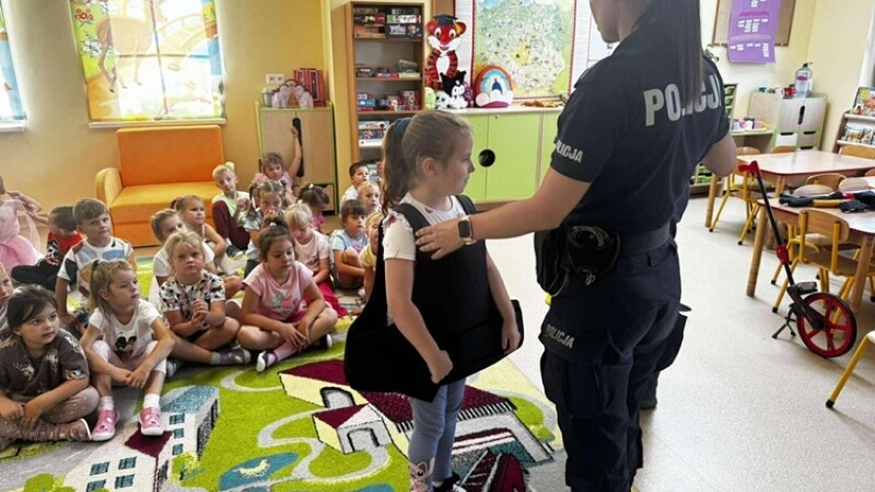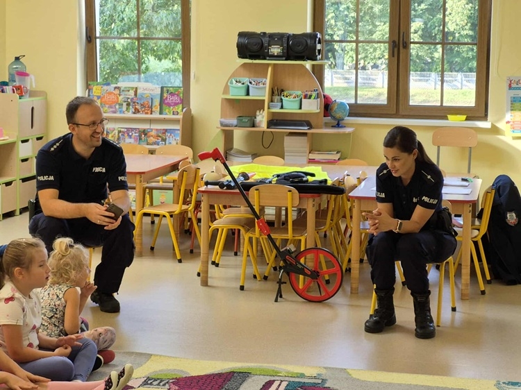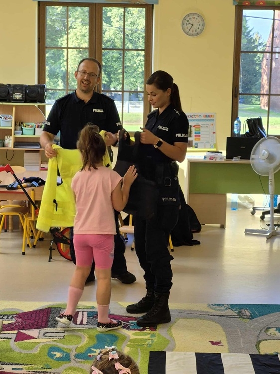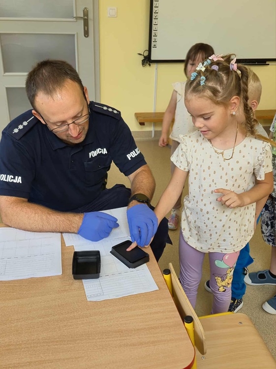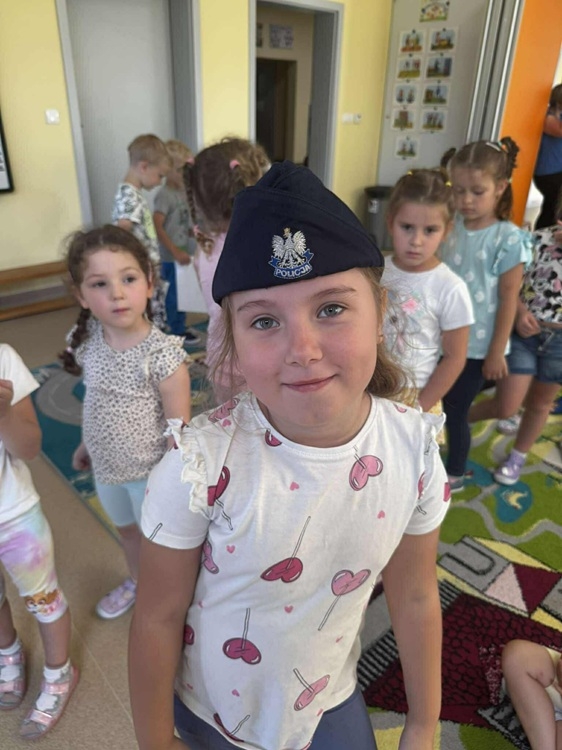 W środę 10 września dzieci z naszego przedszkola wzięły udział w spotkaniu z funkcjonariuszami z Posterunku Policji w Młynarach: mł. asp. Moniką Kaczyńską i st. asp. Tomaszem Kirolem. Celem wizyty było przypomnienie zasad bezpiecznego poruszania się po drodze, przechodzenia przez przejście dla pieszych, numerów alarmowych oraz sposobu zachowania się podczas spotkania z nieznajomym. Podczas spotkania przedszkolaki zadawały pytania i dzieliły się swoim doświadczeniem. Dużym zainteresowaniem cieszyła się prezentacja ubioru i wyposażenia policyjnego, w tym pobranie odcisków palców. Na koniec spotkania nasi goście wręczyli dzieciom odblaski, a przedszkolaki własnoręcznie przygotowane rysunki i podziękowania!